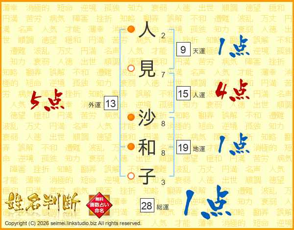 人(2画)見(7画) 沙(8画)和(8画)子(3画)