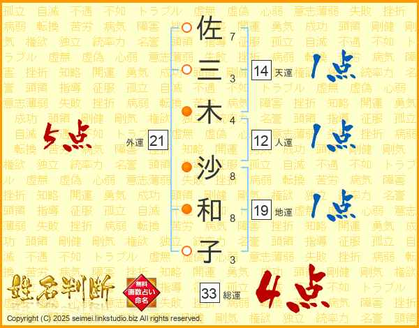 佐(7画)三(3画)木(4画) 沙(8画)和(8画)子(3画)
