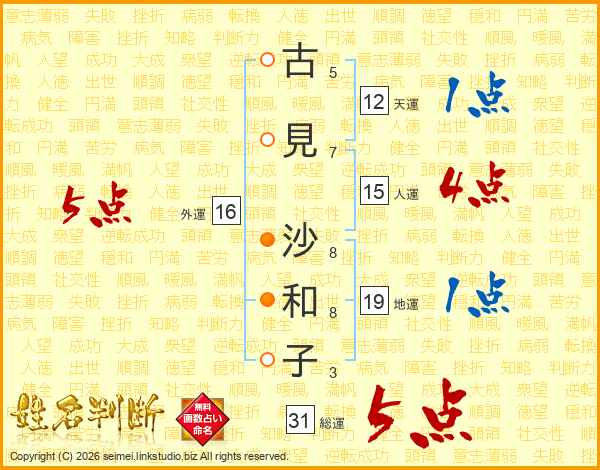 古(5画)見(7画) 沙(8画)和(8画)子(3画)