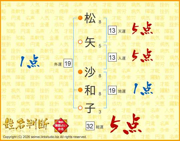 松(8画)矢(5画) 沙(8画)和(8画)子(3画)