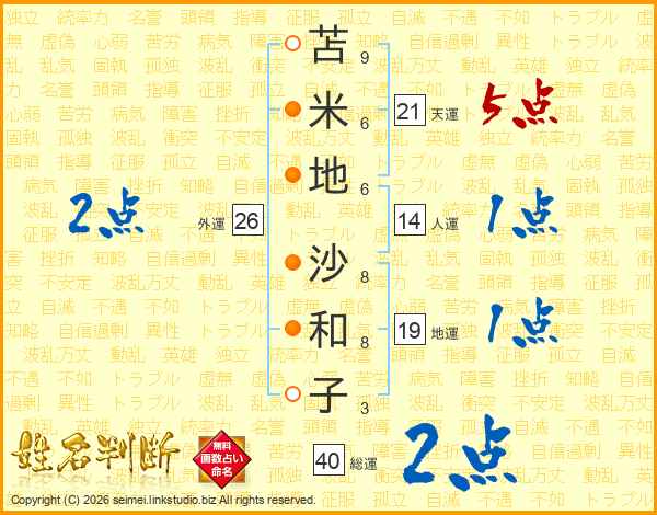 苫(9画)米(6画)地(6画) 沙(8画)和(8画)子(3画)