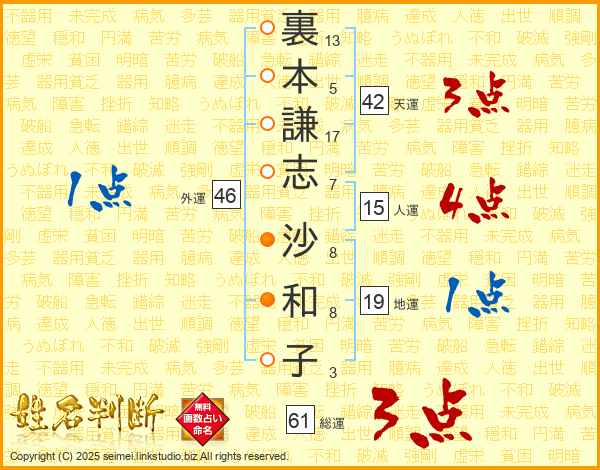 裏本謙志沙和子さんの総運は61画の3点!