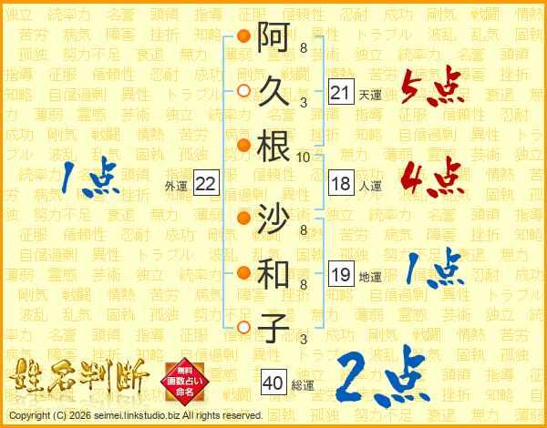阿久根沙和子さんの総運は40画の2点!