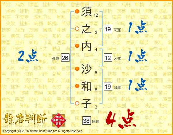 須之内沙和子さんの総運は38画の4点!