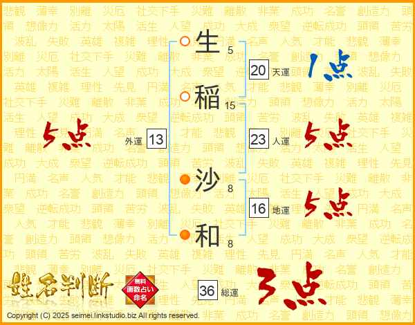 生活面を象徴する運勢です。外部から受ける影響力を表し、結婚運、家庭運や職場、環境への順応性を表します。総運から人運を引いた画数。姓や名が1文字の場合を除く。