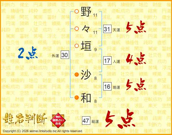 野々垣沙和さんの総運は47画の5点!