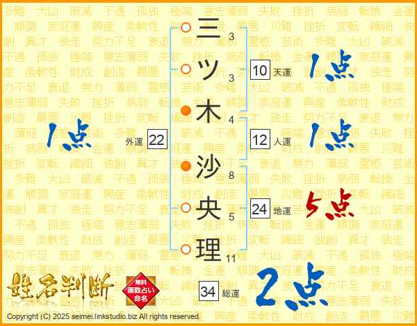 三(3画)ツ(3画)木(4画) 沙(8画)央(5画)理(11画)