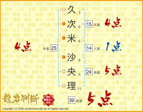 生活面を象徴する運勢です。外部から受ける影響力を表し、結婚運、家庭運や職場、環境への順応性を表します。総運から人運を引いた画数。姓や名が1文字の場合を除く。