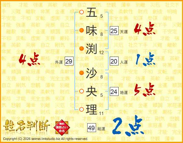 五(5画)味(8画)渕(12画) 沙(8画)央(5画)理(11画)