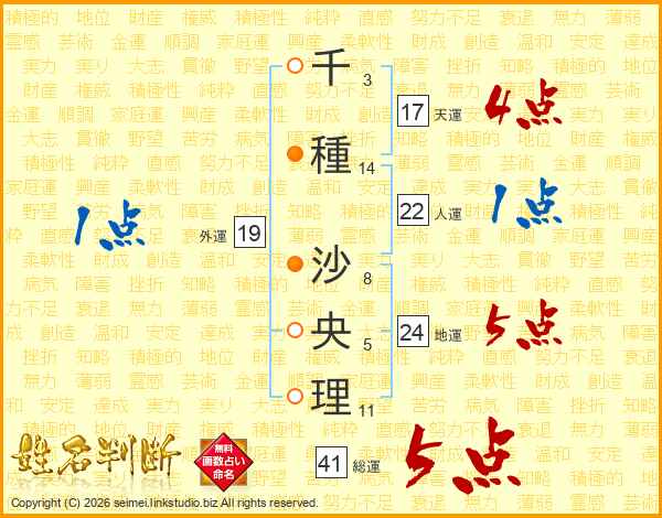千(3画)種(14画) 沙(8画)央(5画)理(11画)