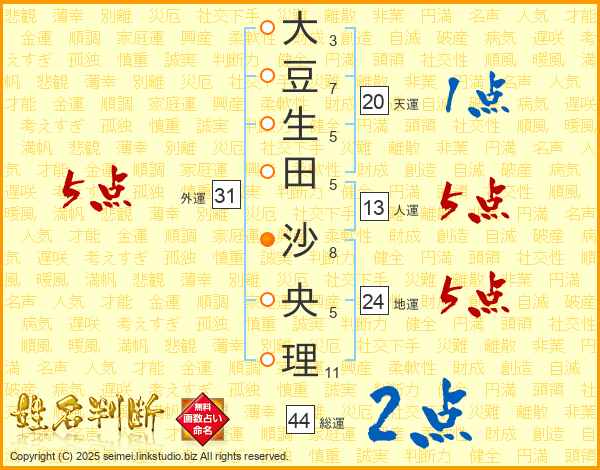 大(3画)豆(7画)生(5画)田(5画) 沙(8画)央(5画)理(11画)