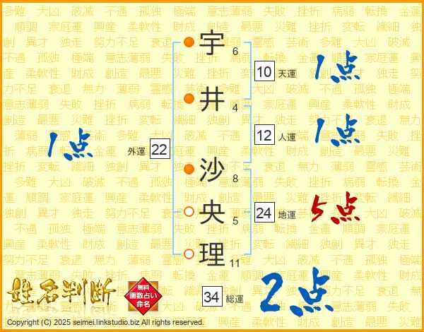 宇(6画)井(4画) 沙(8画)央(5画)理(11画)