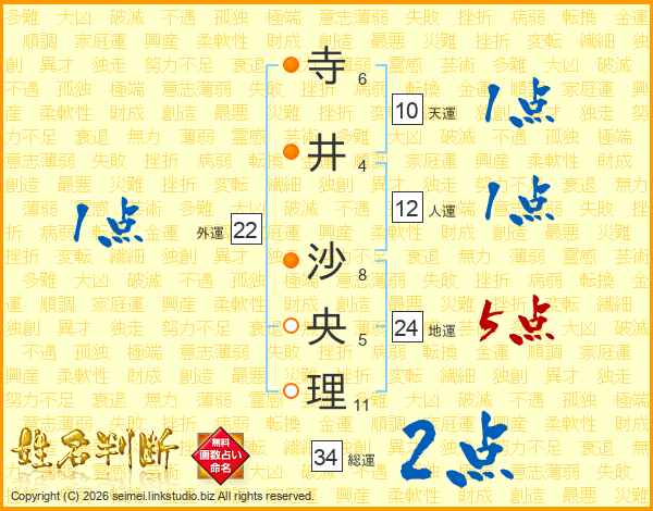 寺(6画)井(4画) 沙(8画)央(5画)理(11画)