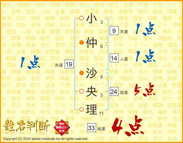小(3画)仲(6画) 沙(8画)央(5画)理(11画)
