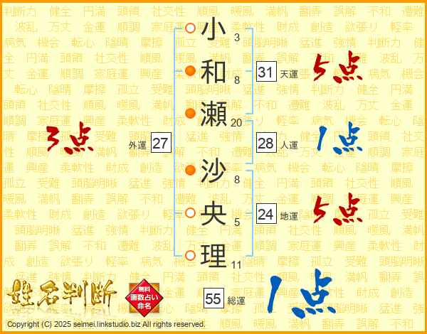 小(3画)和(8画)瀬(20画) 沙(8画)央(5画)理(11画)