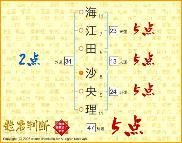 海(11画)江(7画)田(5画) 沙(8画)央(5画)理(11画)