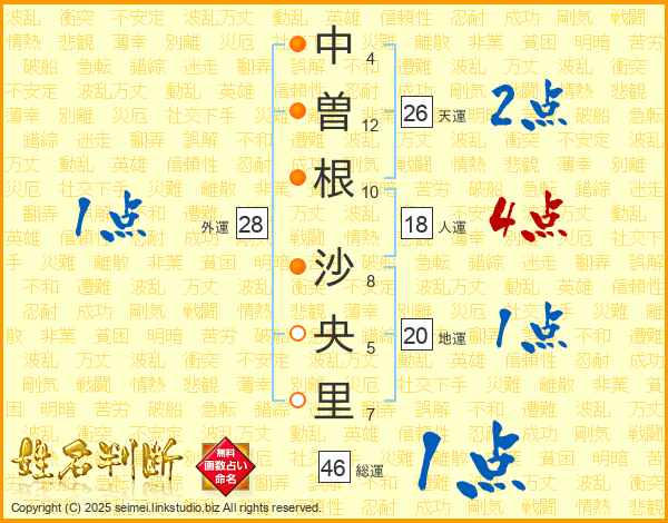 中(4画)曽(12画)根(10画) 沙(8画)央(5画)里(7画)