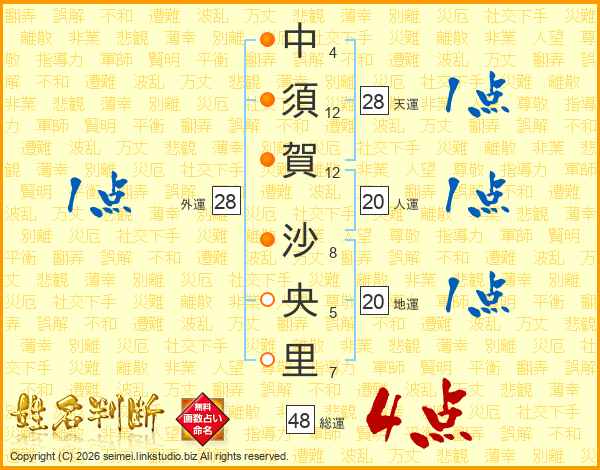 中(4画)須(12画)賀(12画) 沙(8画)央(5画)里(7画)