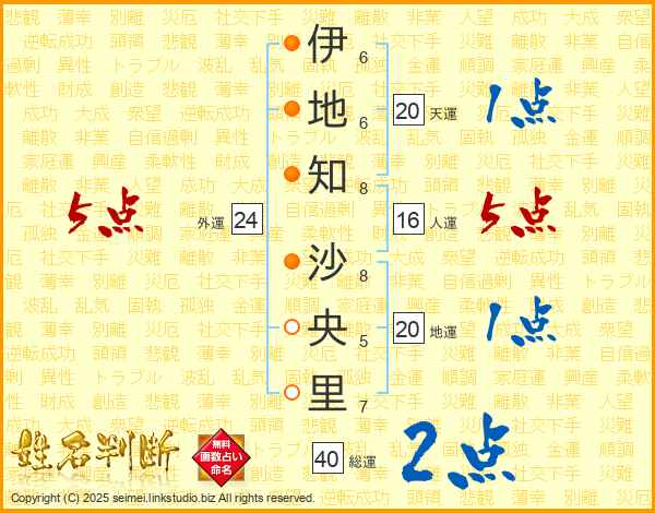 伊(6画)地(6画)知(8画) 沙(8画)央(5画)里(7画)