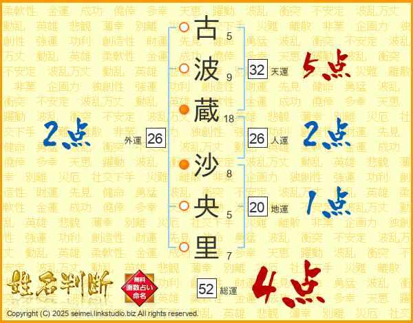 古(5画)波(9画)蔵(18画) 沙(8画)央(5画)里(7画)