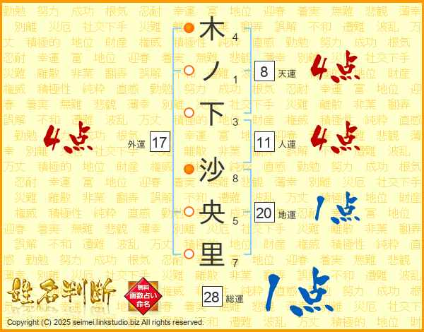 木(4画)ノ(1画)下(3画) 沙(8画)央(5画)里(7画)