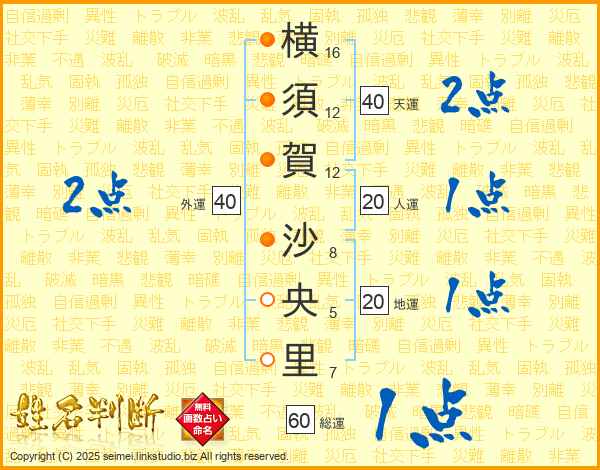 横(16画)須(12画)賀(12画) 沙(8画)央(5画)里(7画)