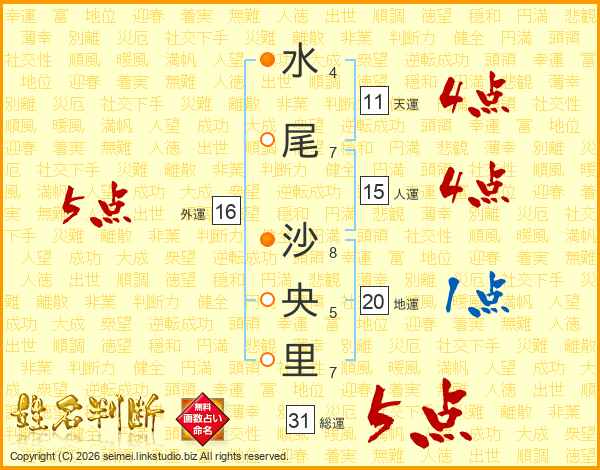 水(4画)尾(7画) 沙(8画)央(5画)里(7画)