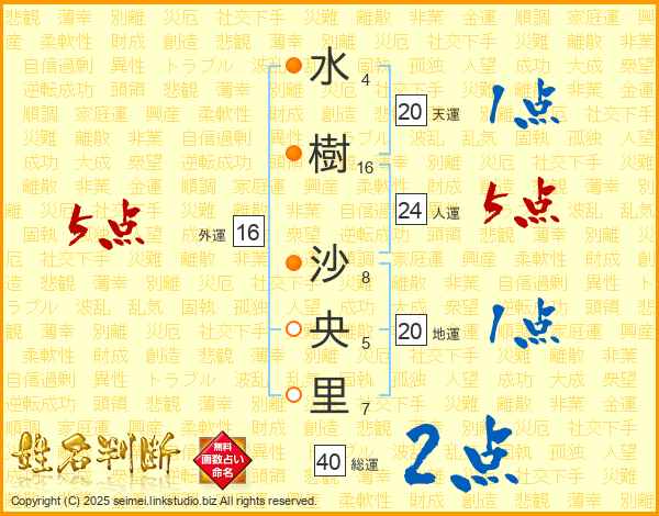 水(4画)樹(16画) 沙(8画)央(5画)里(7画)
