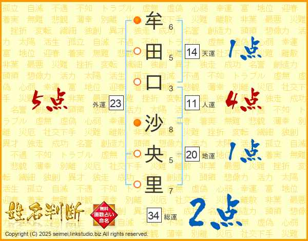 牟(6画)田(5画)口(3画) 沙(8画)央(5画)里(7画)