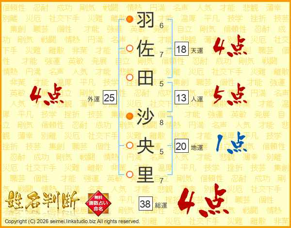 羽(6画)佐(7画)田(5画) 沙(8画)央(5画)里(7画)