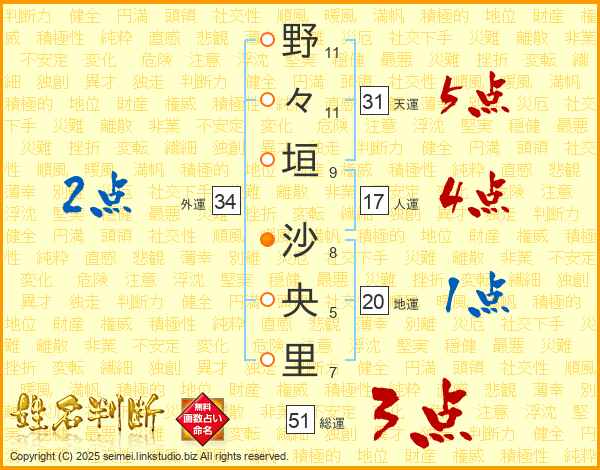 野(11画)々(11画)垣(9画) 沙(8画)央(5画)里(7画)