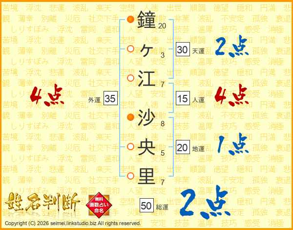 鐘(20画)ヶ(3画)江(7画) 沙(8画)央(5画)里(7画)