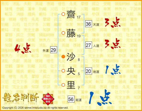 齋(17画)藤(19画) 沙(8画)央(5画)里(7画)
