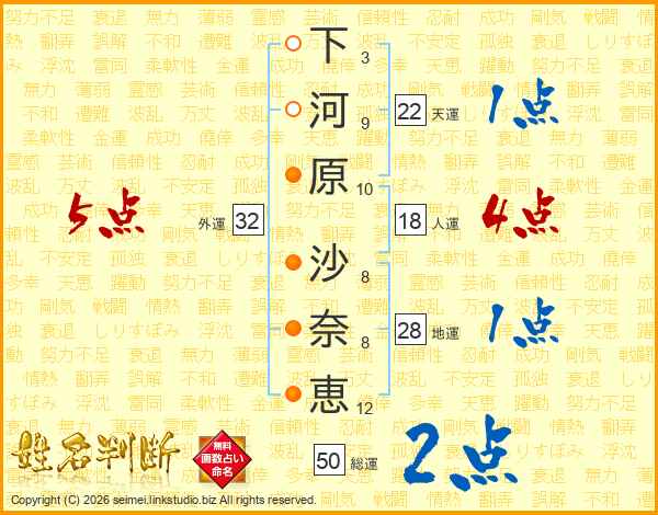 下(3画)河(9画)原(10画) 沙(8画)奈(8画)恵(12画)
