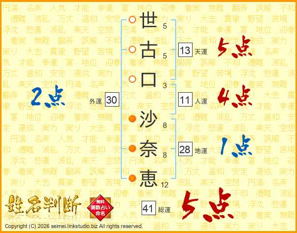 世(5画)古(5画)口(3画) 沙(8画)奈(8画)恵(12画)