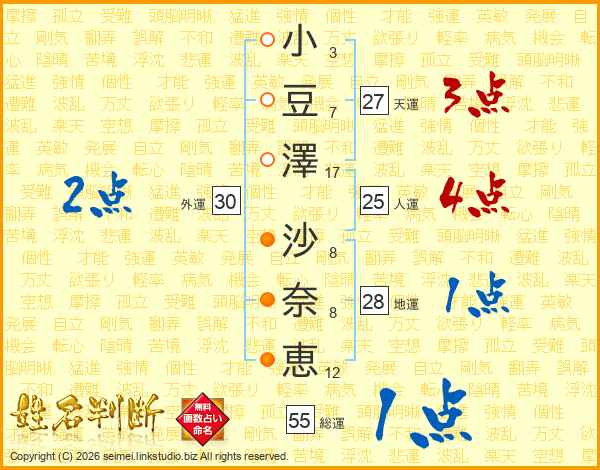 小(3画)豆(7画)澤(17画) 沙(8画)奈(8画)恵(12画)