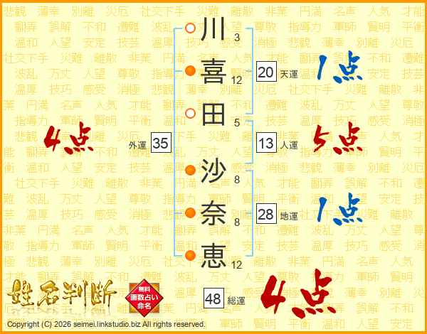 川(3画)喜(12画)田(5画) 沙(8画)奈(8画)恵(12画)
