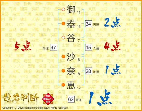 御(11画)器(16画)谷(7画) 沙(8画)奈(8画)恵(12画)