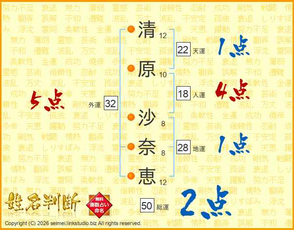 清(12画)原(10画) 沙(8画)奈(8画)恵(12画)