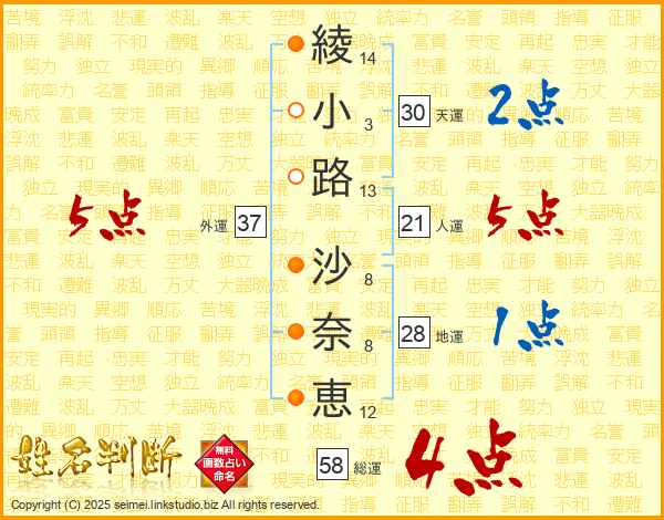 綾(14画)小(3画)路(13画) 沙(8画)奈(8画)恵(12画)