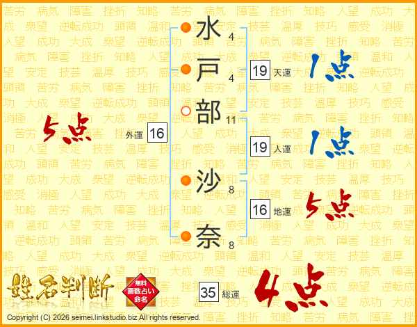 水(4画)戸(4画)部(11画) 沙(8画)奈(8画)