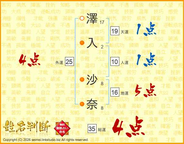 澤(17画)入(2画) 沙(8画)奈(8画)