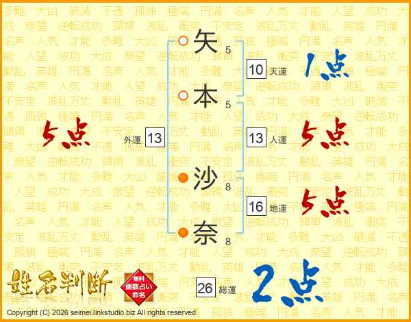 矢本沙奈さんの総運は26画の2点!
