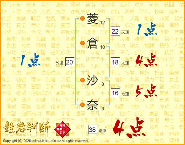 菱(12画)倉(10画) 沙(8画)奈(8画)