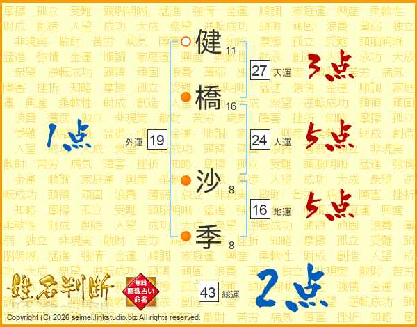 あなたの人生を表す1番重要な運勢です。生涯を通じて影響する総合運となり、主に50歳以降の晩年期に影響を及ぼします。苗字と名前の合計画数。
