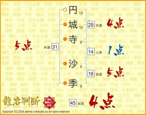 円(13画)城(10画)寺(6画) 沙(8画)季(8画)