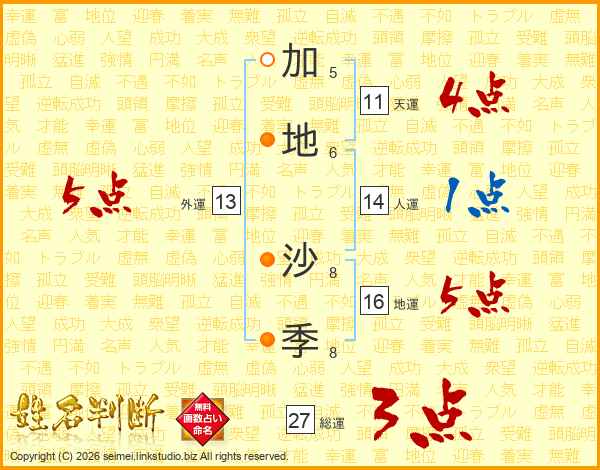 生活面を象徴する運勢です。外部から受ける影響力を表し、結婚運、家庭運や職場、環境への順応性を表します。総運から人運を引いた画数。姓や名が1文字の場合を除く。