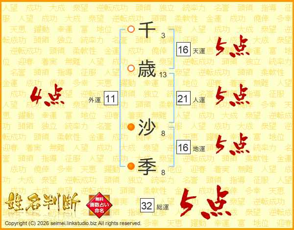 千(3画)歳(13画) 沙(8画)季(8画)