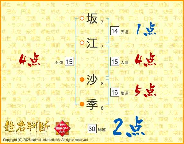 坂(7画)江(7画) 沙(8画)季(8画)