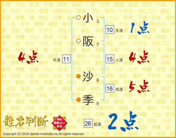 生活面を象徴する運勢です。外部から受ける影響力を表し、結婚運、家庭運や職場、環境への順応性を表します。総運から人運を引いた画数。姓や名が1文字の場合を除く。
